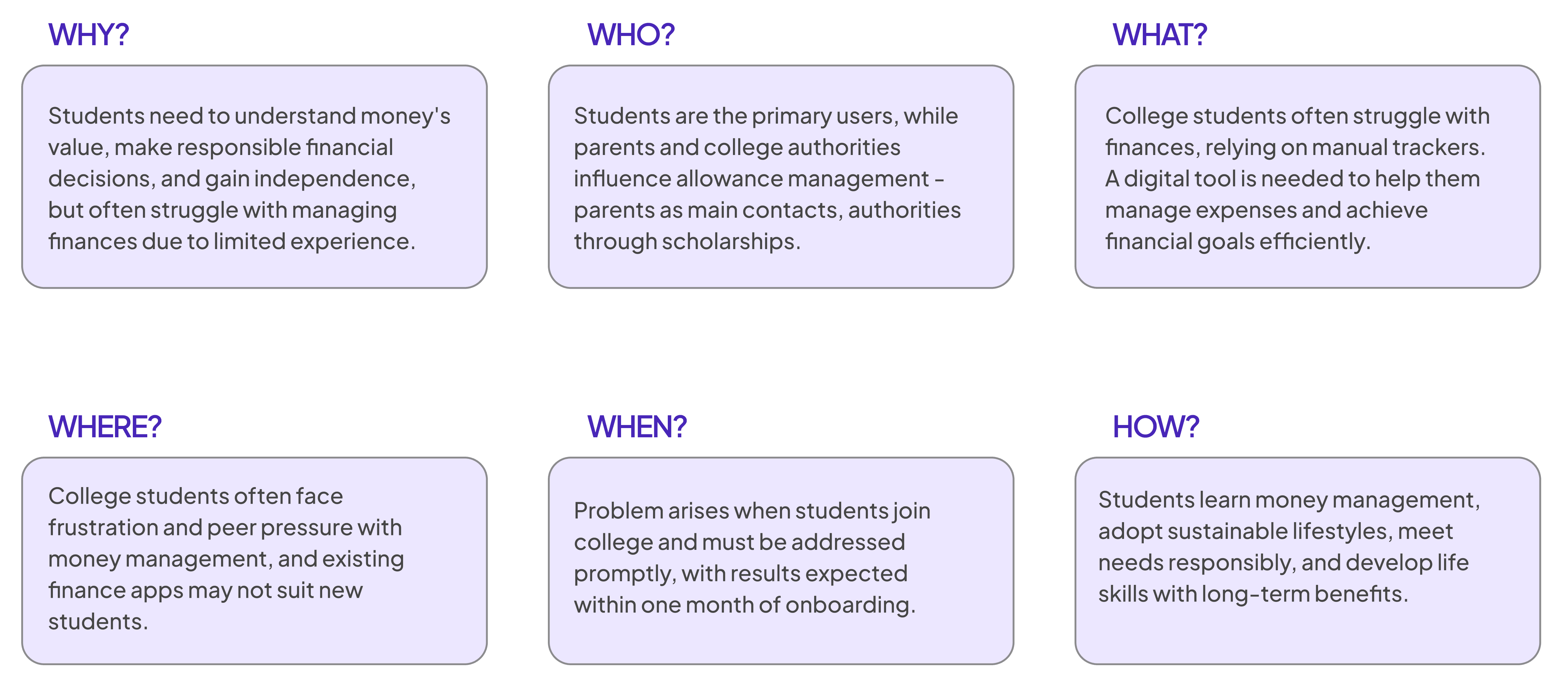Many students struggle to manage their finances effectively due to limited income, irregular spending patterns, and a lack of engaging tools that build sustainable money managing habits.