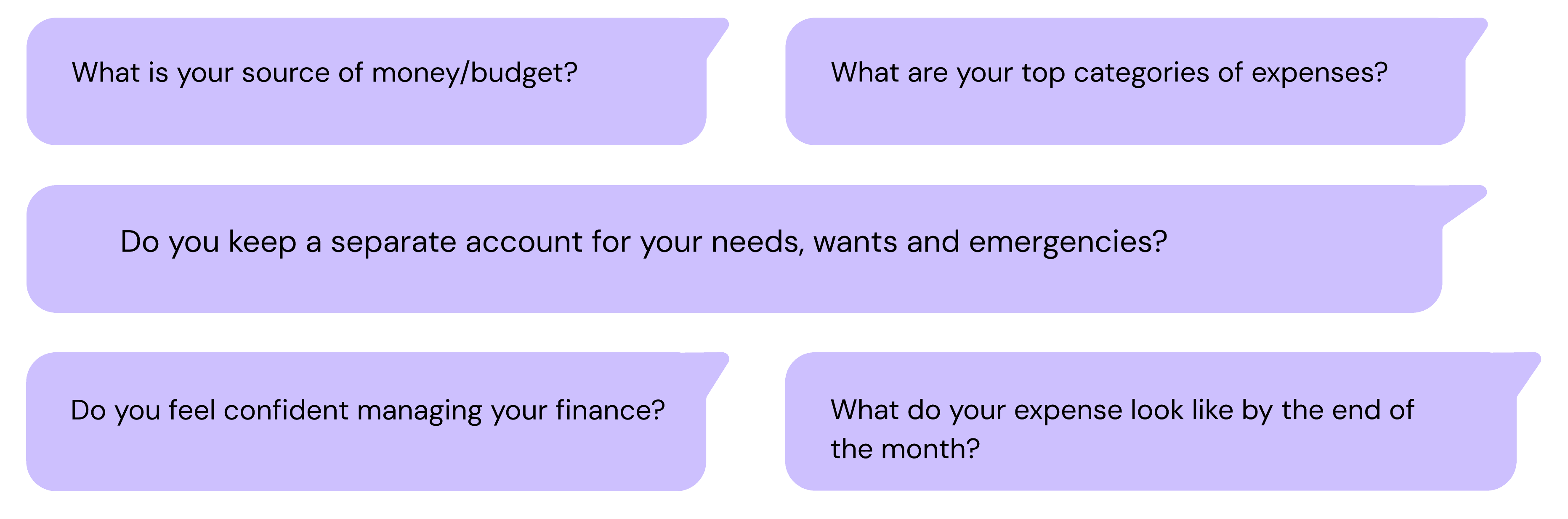 User interview questions focus on age, education, income and expenses, spending habits, expense tracking, budgeting and savings strategies, planning for big or unexpected expenses, and use of financial apps.
