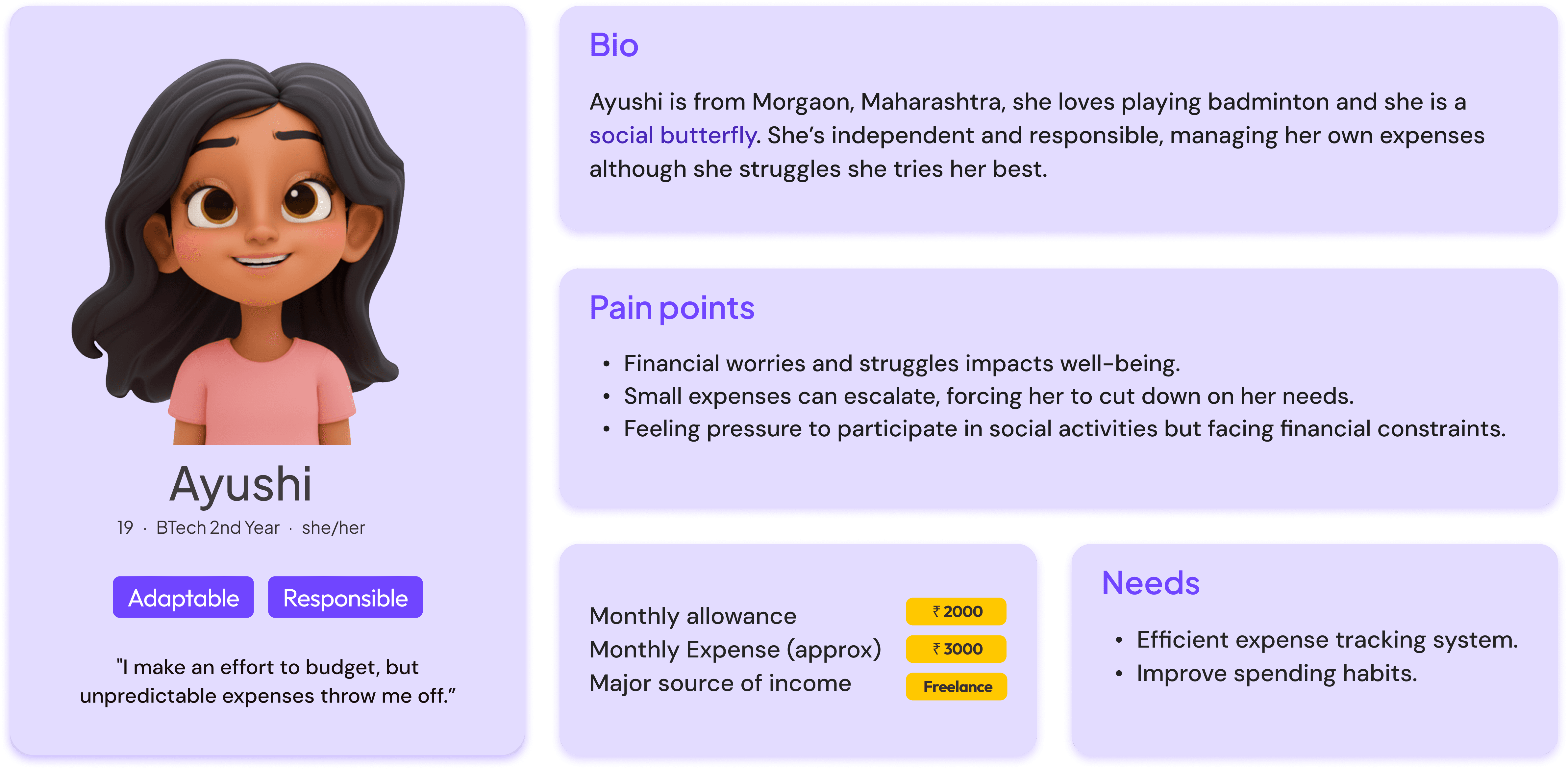 How might we help Ayushi, 19yr old student who is a social butterfly to build a healthier and more confident relationship with money even though she is navigating the constraints because of limited funds, peer pressure, and financial inexperience?