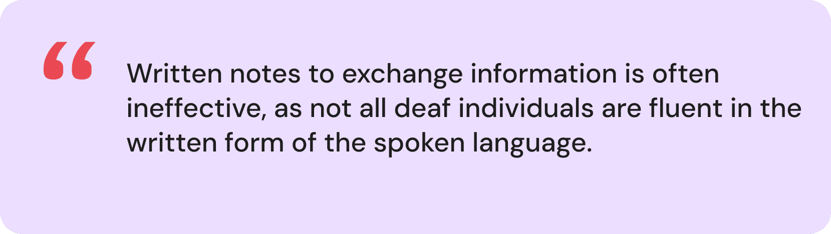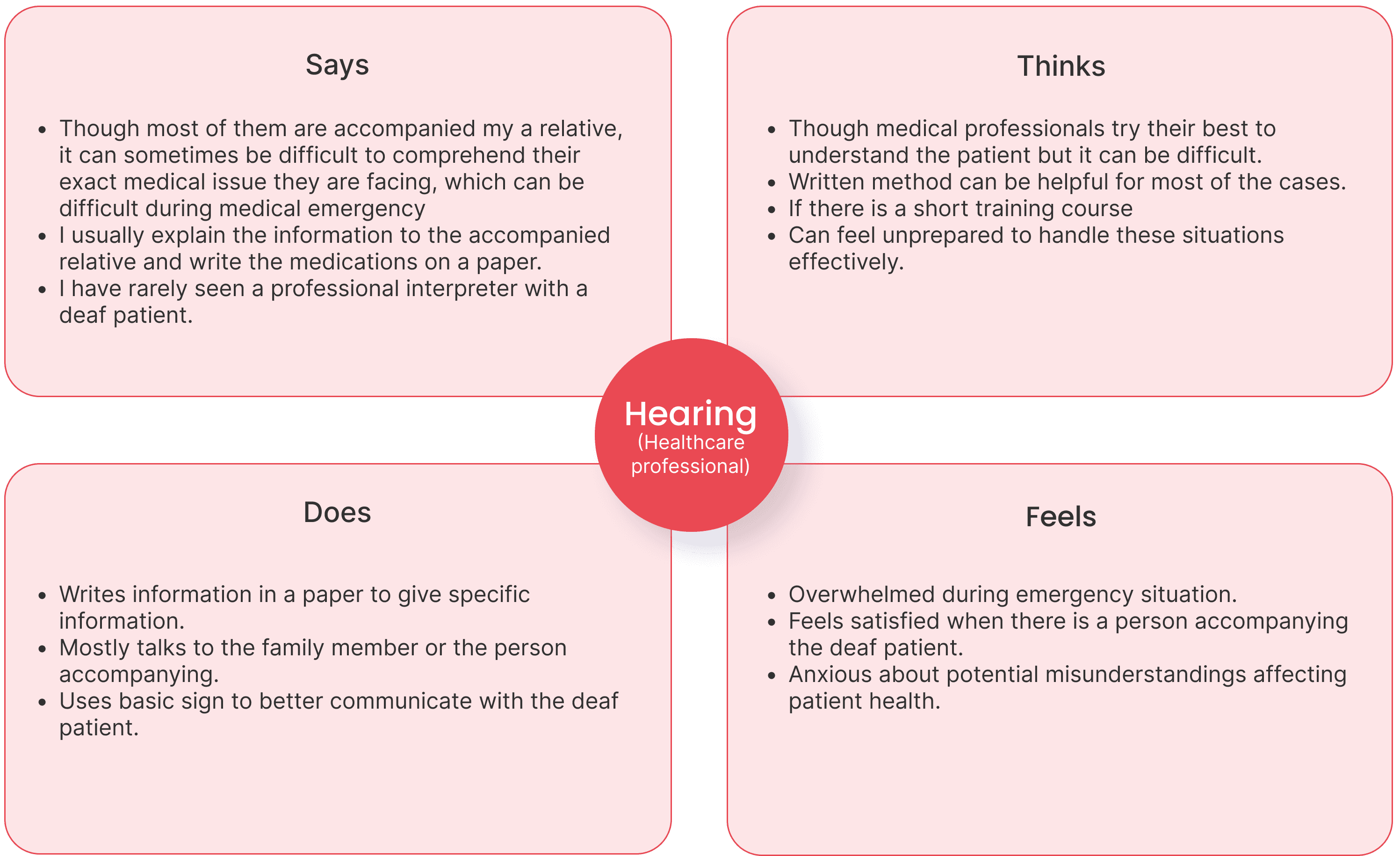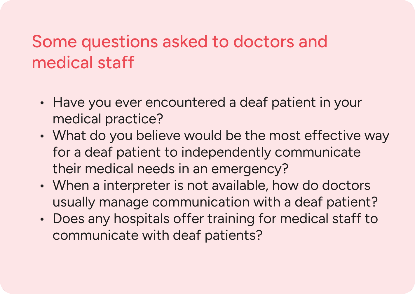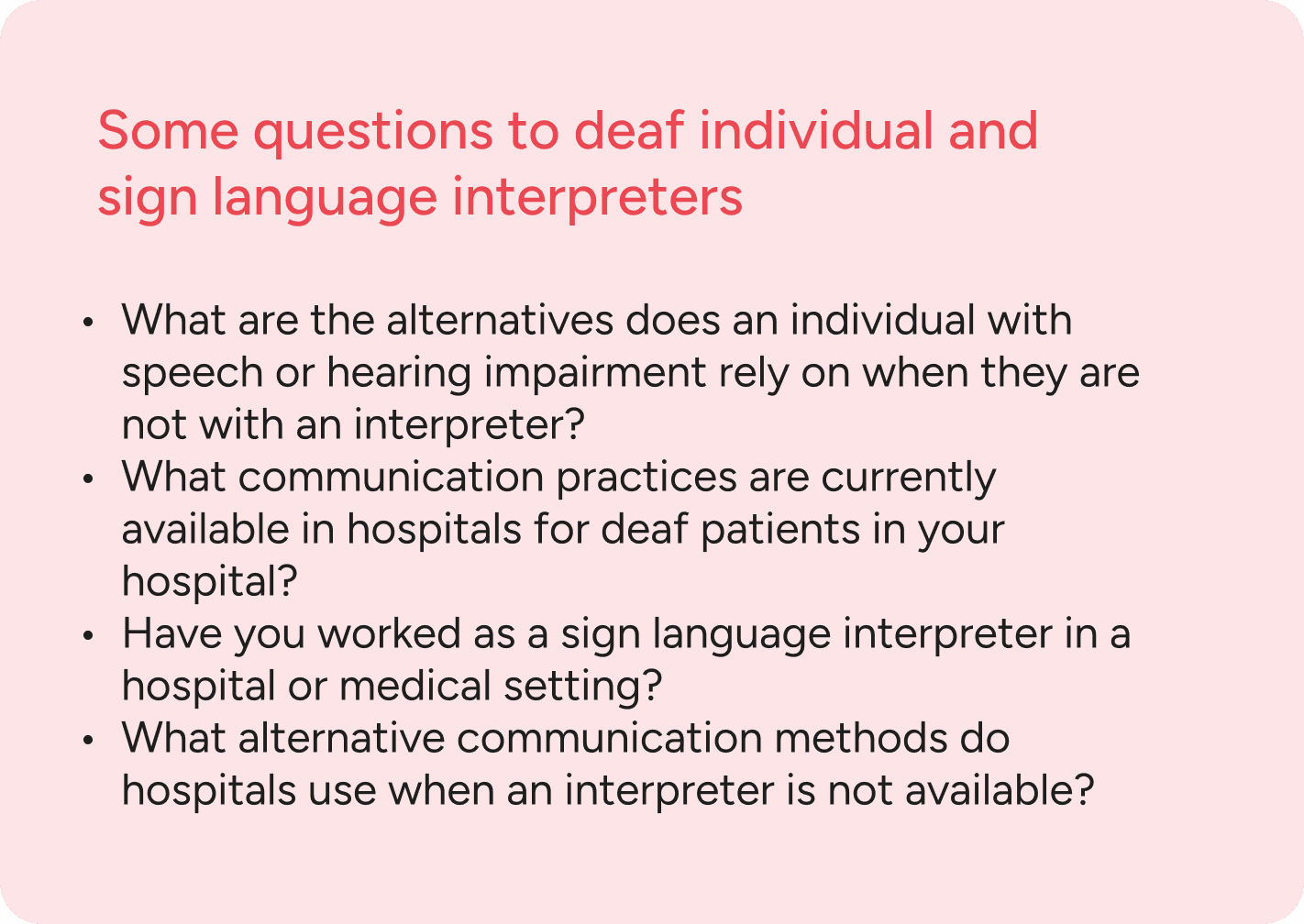 Engaging with individuals from deaf community, sign language interpreters, special education teachers, and accessibility experts to understand existing challenges, current solutions, and potential areas for improvement in medical communication for deaf individuals.