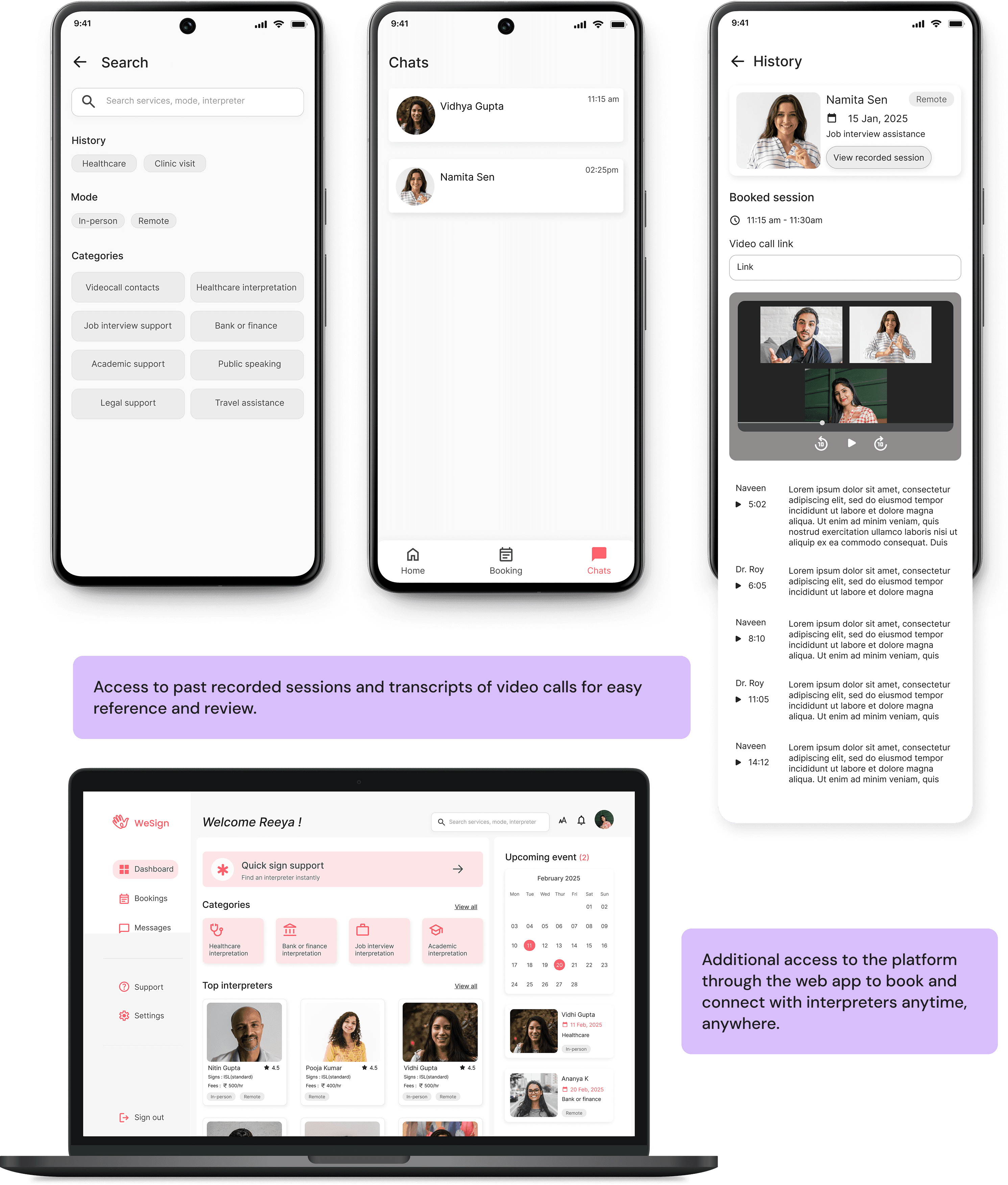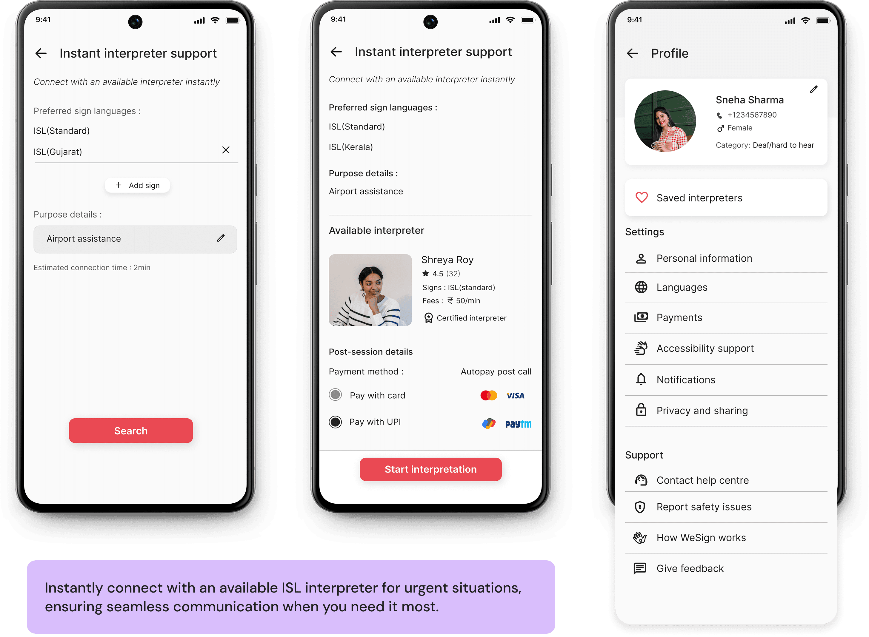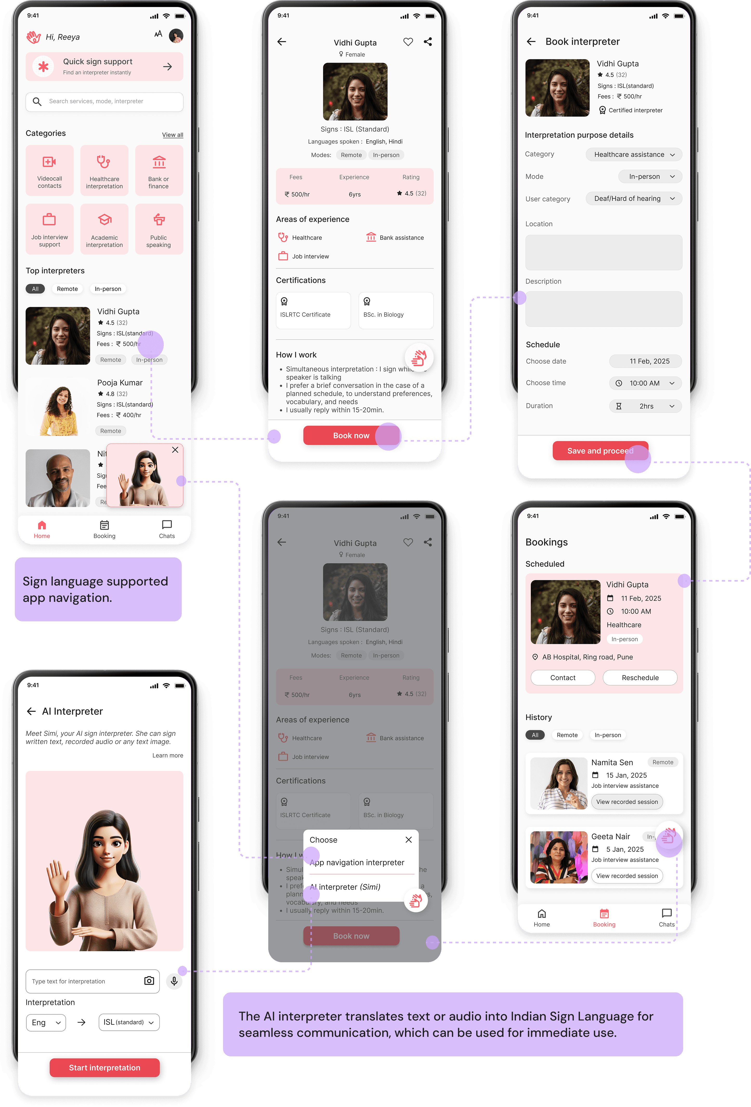 This project aims to design a digital platform that bridges the communication gap between the deaf and hearing communities by providing on-demand access to professional Indian Sign Language (ISL) interpreters. Through real-time video call support and scheduled in-person interpretation, the platform ensures seamless communication in essential scenarios such as bank visits, job interviews, and public speaking.